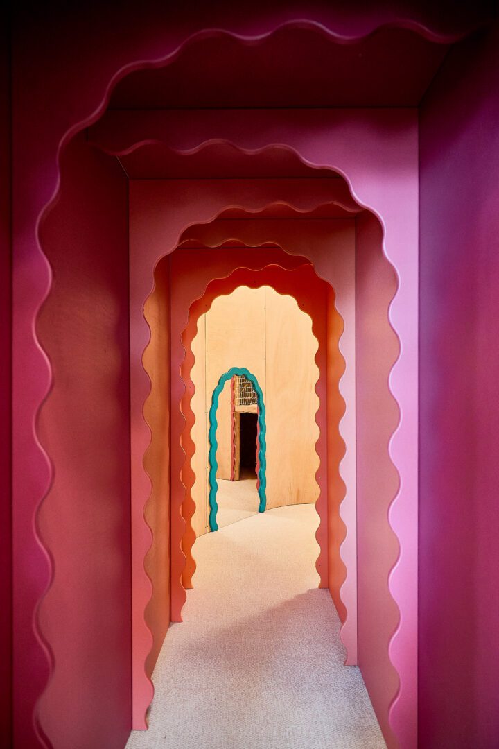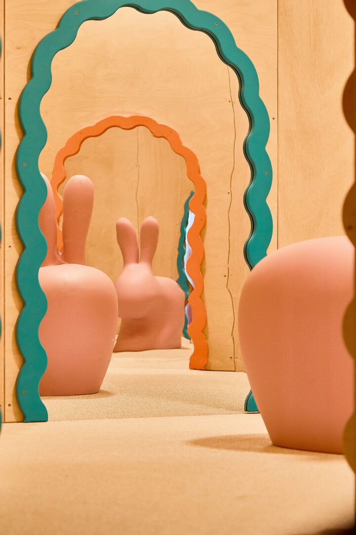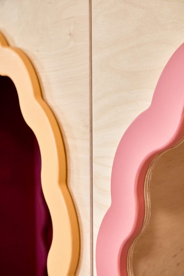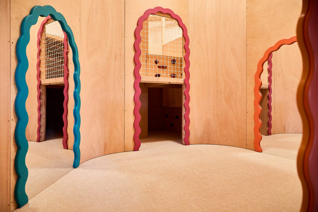 Pomieszczenie w kształcie trójkąta z licznymi szachtami i słupami stanowiło wyzwanie projektowe, które zamieniliśmy w atut bawialni. Małpi gaj został wpisany w narożnik, w którym wydzieliliśmy ścianę dekoracyjną – swoistą bramę do świata zabawy. Dzieci oraz rodzice mogą wspólnie zatopić się w świecie beztroski, ponieważ wewnątrz ukryliśmy sekretny pokój wypełniony lustrami.